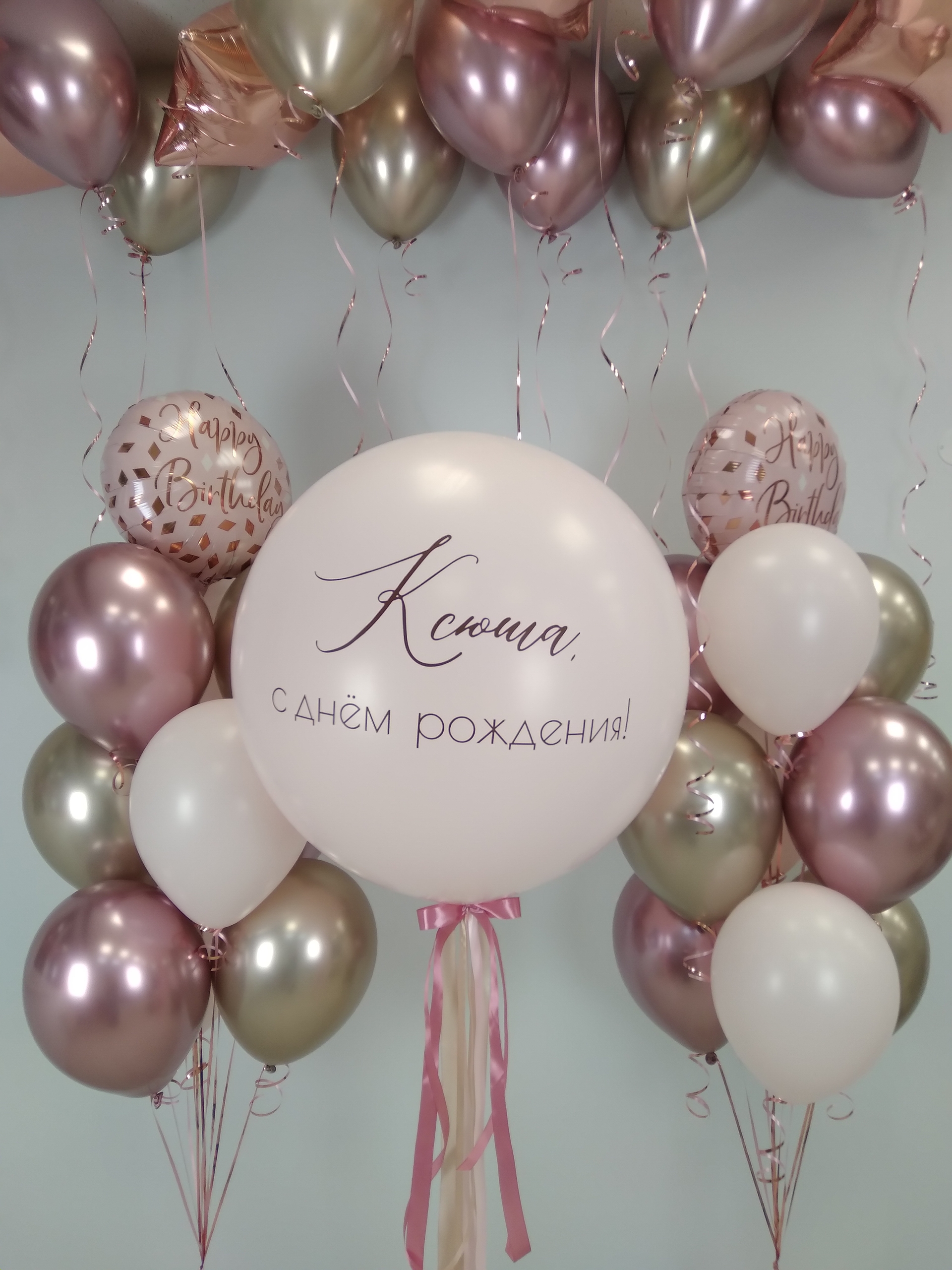 В наборе: 2 фонтана по 10 шаров, состав каждого: 6 шампань хром, 3 стандарт, круг Happy Birthday Большой шар с надписью Под потолок: 10 хром, 5 звезд