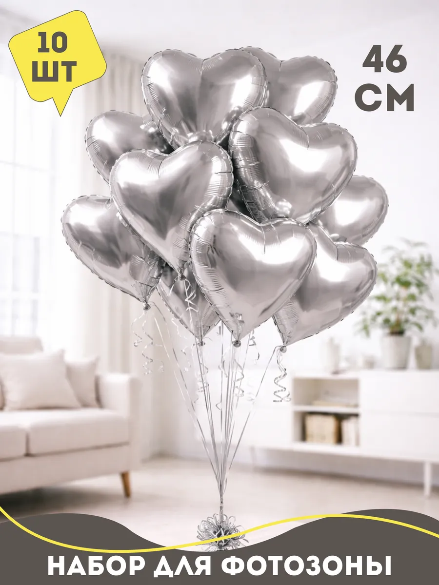 Набор: фольгированные сердца серебро 46 см 10 шт. Яркие и разноцветные однотонные шарики на др превосходно подойдут для декорирования и украшения помещения на любое торжество или праздник. Воздушные шарики и аксессуары - это отличный подарок для мальчика и для девочки, набор для дня рождения или как подарки в детский сад. Шары - отличный подарочный набор папе или маме на день рождения. Плотные латексные шары идеально подходят для надувания как гелием (специальный газ для шаров), с помощью баллона, так и обычным воздухом с помощью насоса для шаров или без использования дополнительных средств. Шарами можно украсить фотозону на день рождения, Новый год, 1 сентября, последний звонок, выпускной в садике и школе, 23 февраля, день святого Валентина, выписку из роддома, вечеринку, любой другой праздник или юбилей. Сделать арку на свадьбу для молодоженов или украсить детский праздник. Можно использовать как подарки женщинам для праздника 8 марта или как набор на день рождения подруге или другу, брату или сестре, мужу или жене. Шарики принесут массу положительных эмоций как детям, так и взрослым, создадут праздничное настроение и станут примечательным атрибутом торжества. Шарики изготовлены из плотного натурального латекса, не лопаются, не имеют запаха и хорошо раздуваются. Абсолютно гипоаллергенны и безопасны как для взрослых, так и для детей. Набор шариков станет отличным сюрпризом для поздравления с Днем Рождения (Happy Birthday) или просто как сюрприз без повода. Шары поставляются в не надутом виде. Также в дополнение к шарам рекомендуем приобрести товары для праздника. Упаковка воздушных шаров изготовлена из полиэтилена. Заходите в наш магазин Happy Fiesta, у нас много различных шаров на любой вкус и проходят распродажи, акции, скидки! Переходите в личный кабинет и добавляйте наш бренд в избранное, чтобы не пропустить новинки!
