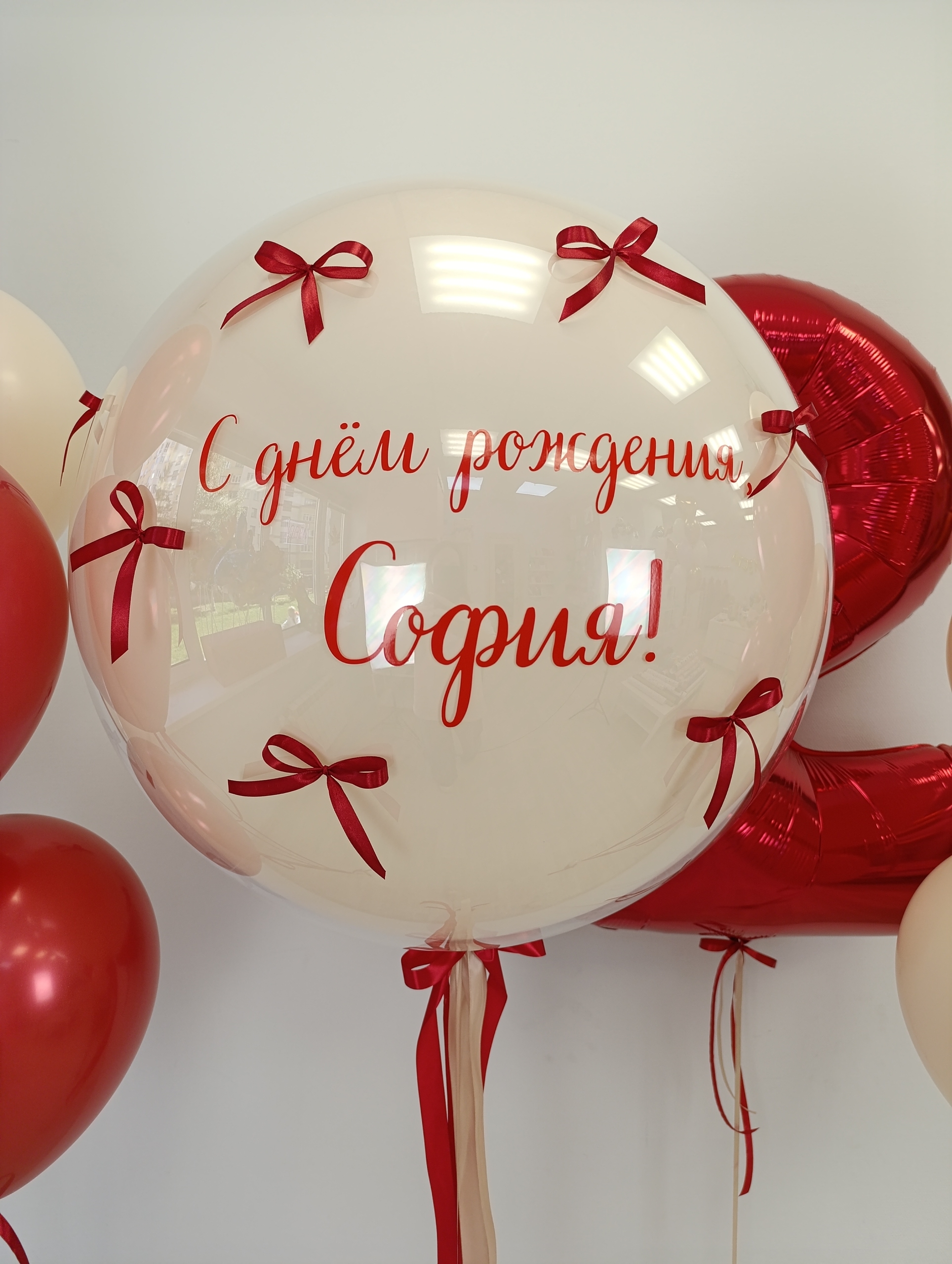 В наборе: "Стеклянный" Шар-гигант с бантиками и надписью 2 фонтана по 5 шаров (5 красный хром, 5 кремовый), шары на атласных лентах Большая цифра