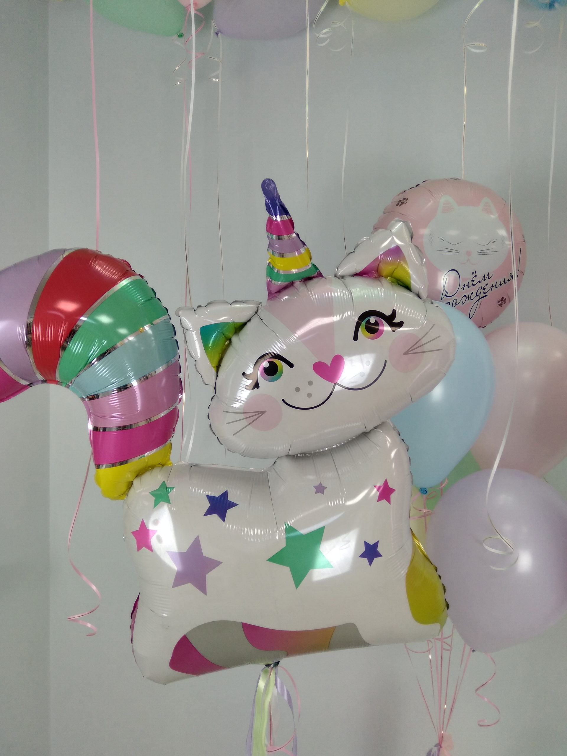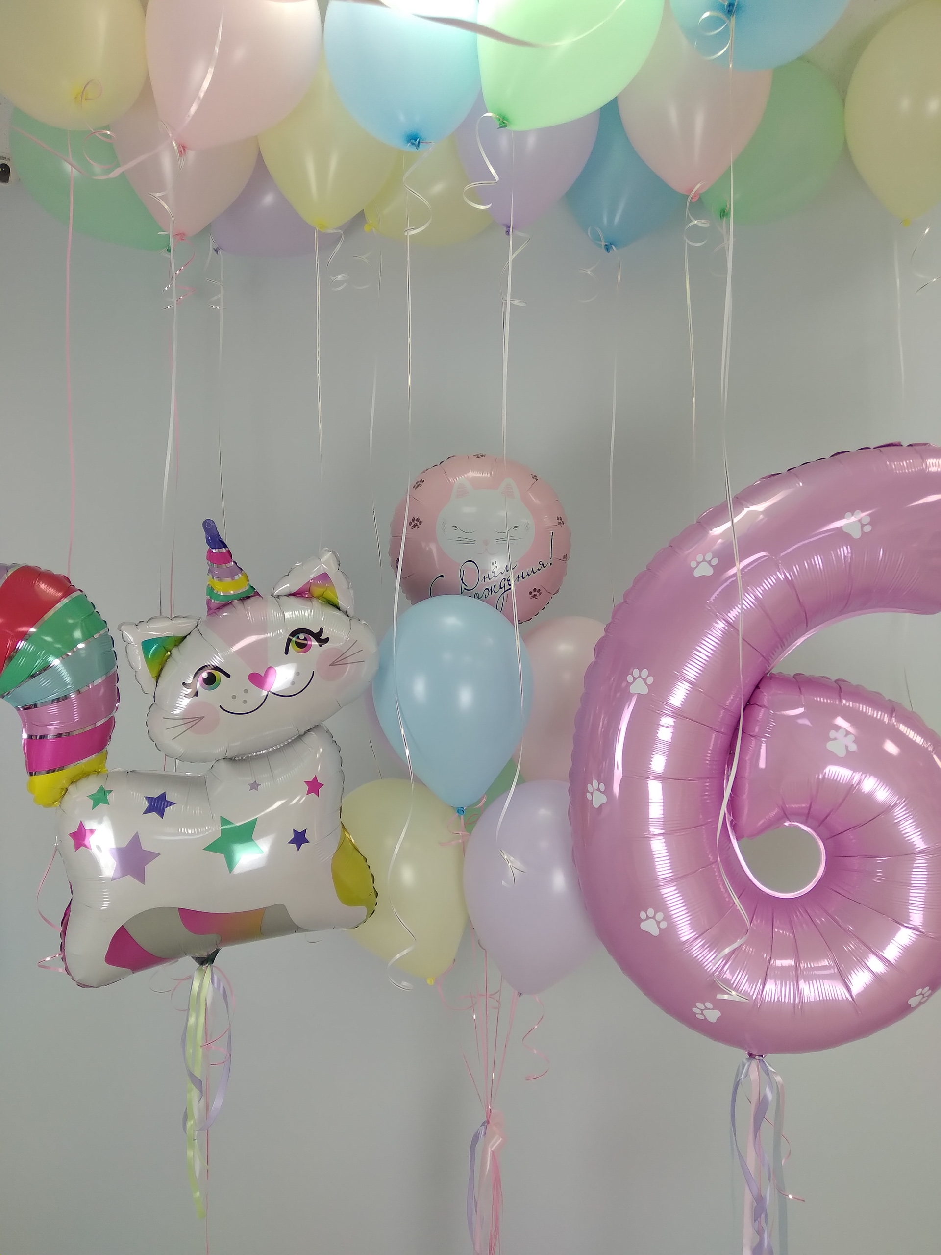 В наборе: 30 шаров под потолок Фонтан из 7 шаров - круг с рисунком, 6 стандарт Цифра с декоративными наклейками Фигура Кошка-единорог