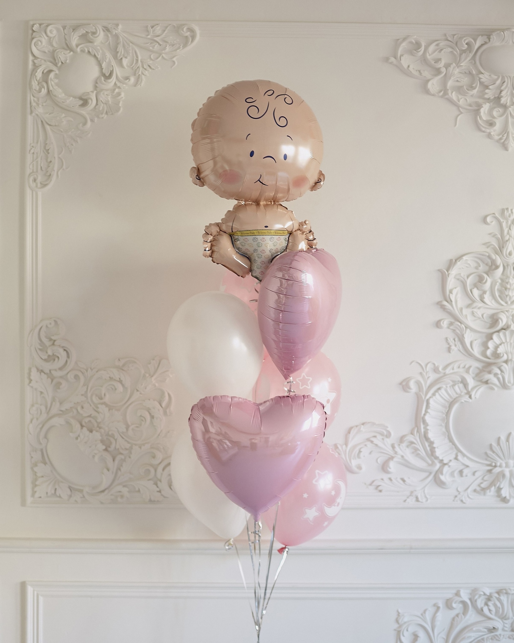 Состав: фольгированная фигура "Пупс", 2 фольгированных сердца, 3 шара с рисунком "Луна и звёзды", 2 шара стандарт (белый пастель), груз.