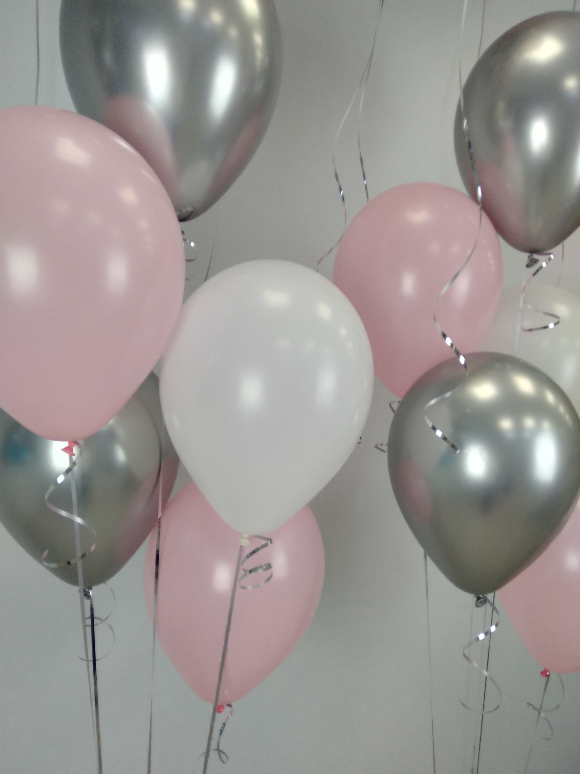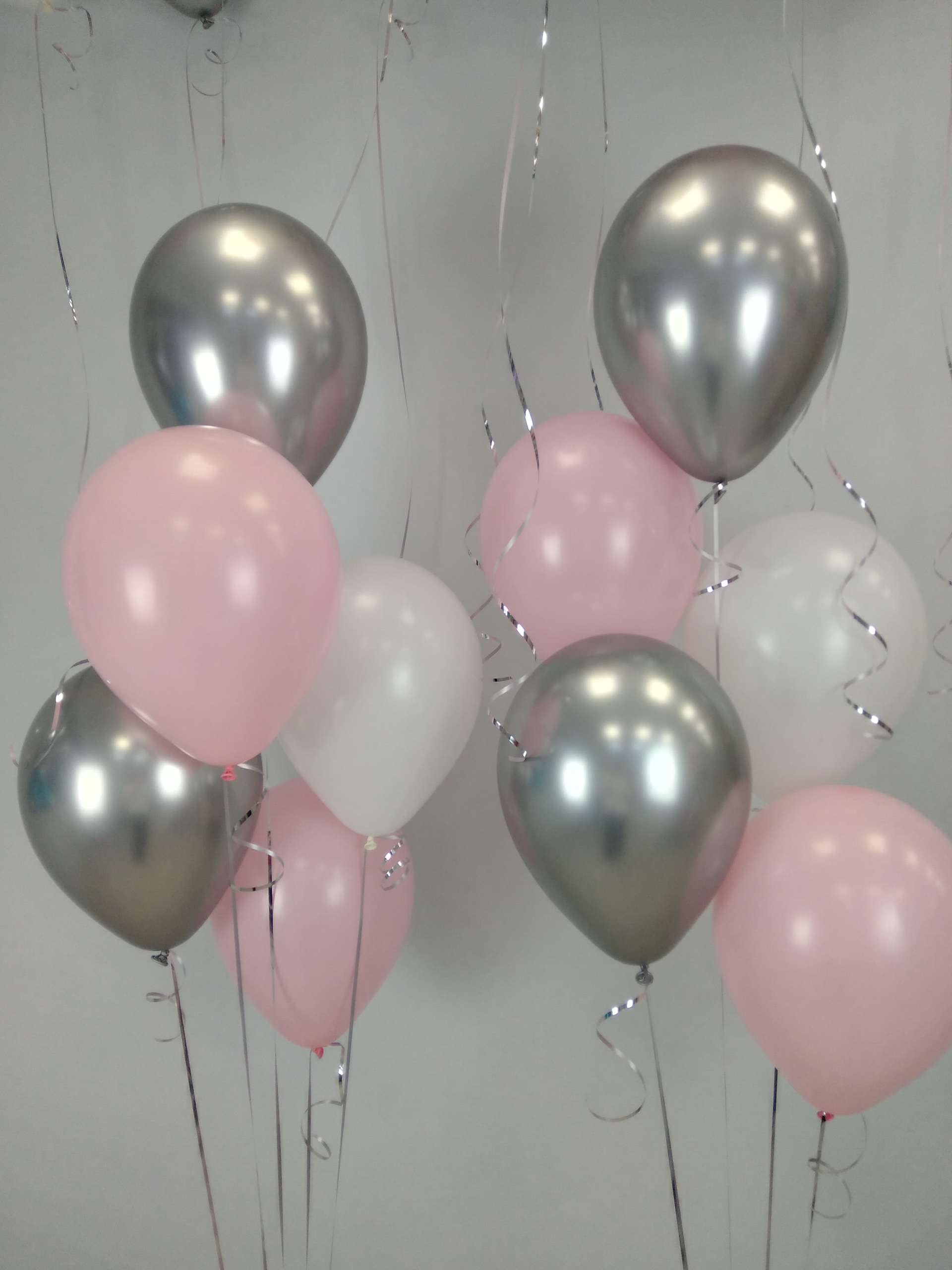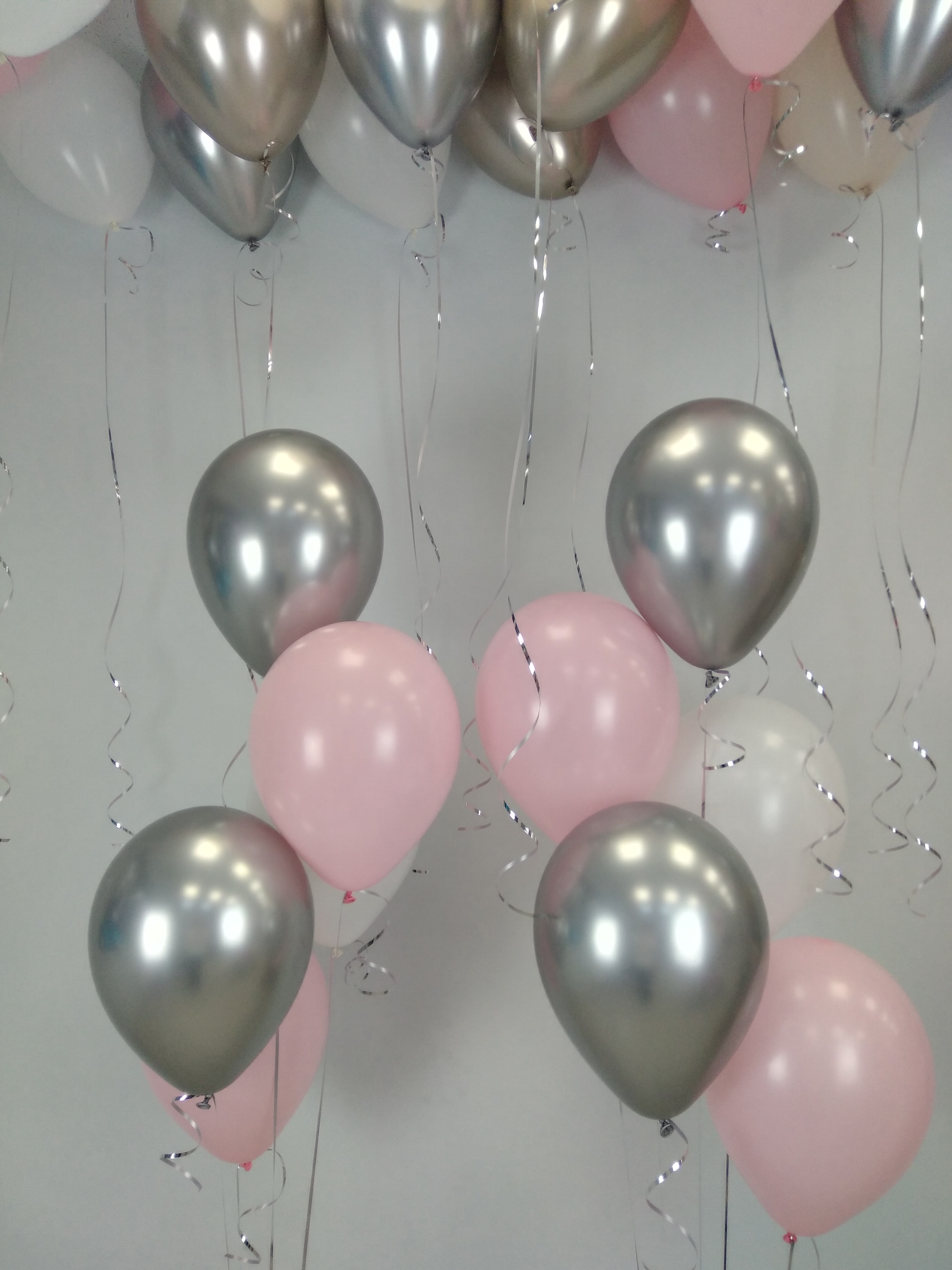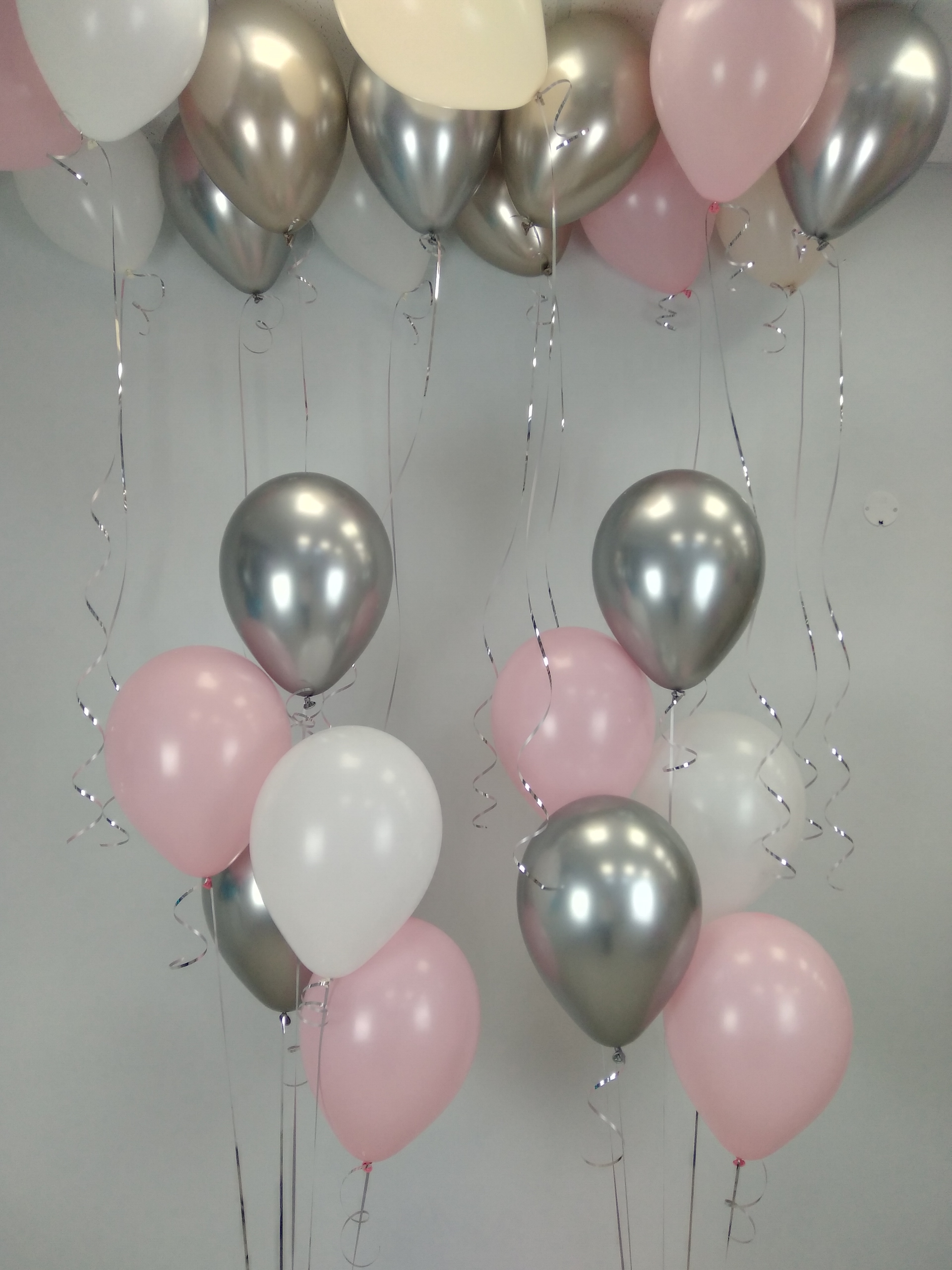 2 фонтана по 5 шаров (2 розовый, 1 белый, 2 хром серебро) 15 шаров под потолок (3 белый 3 розовый 3 кремовый 3 хром серебро 3 хром шампань)