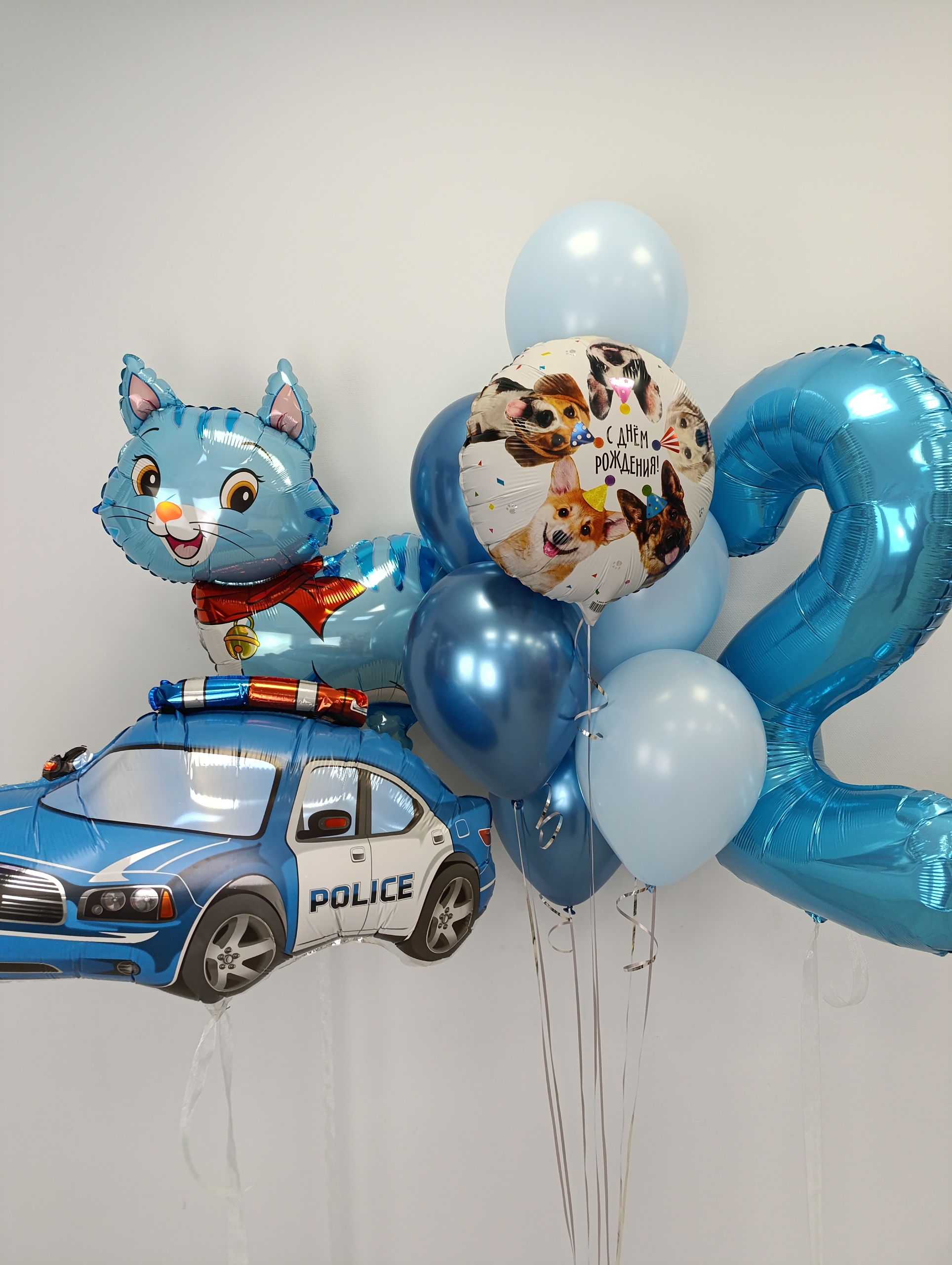 В наборе: - Большая цифра - Фигура Котенок - Фигура Полицейская машина - Фонтан из 7 шаров - 3 хром, 3 стандарт, круг с рисунком