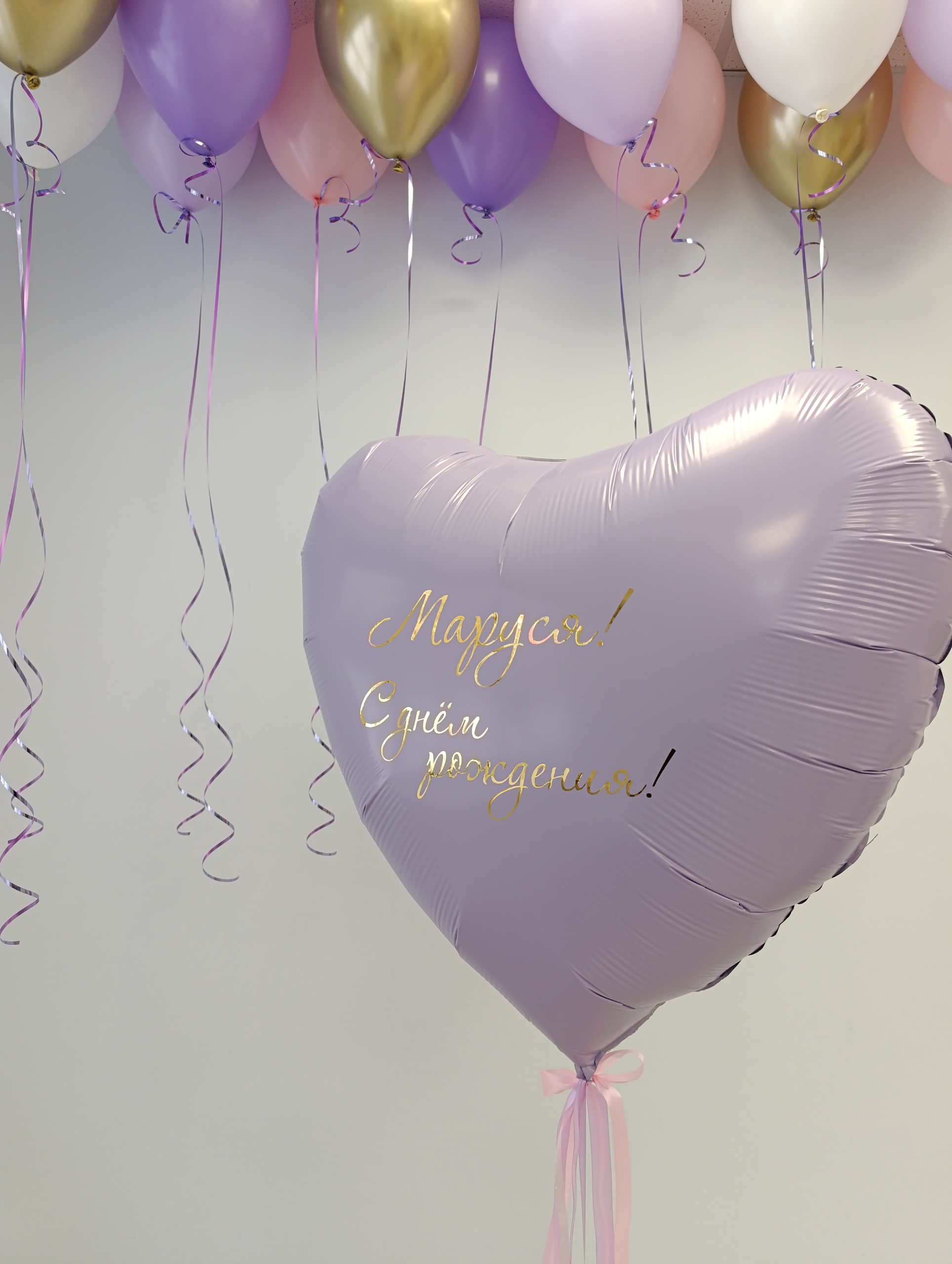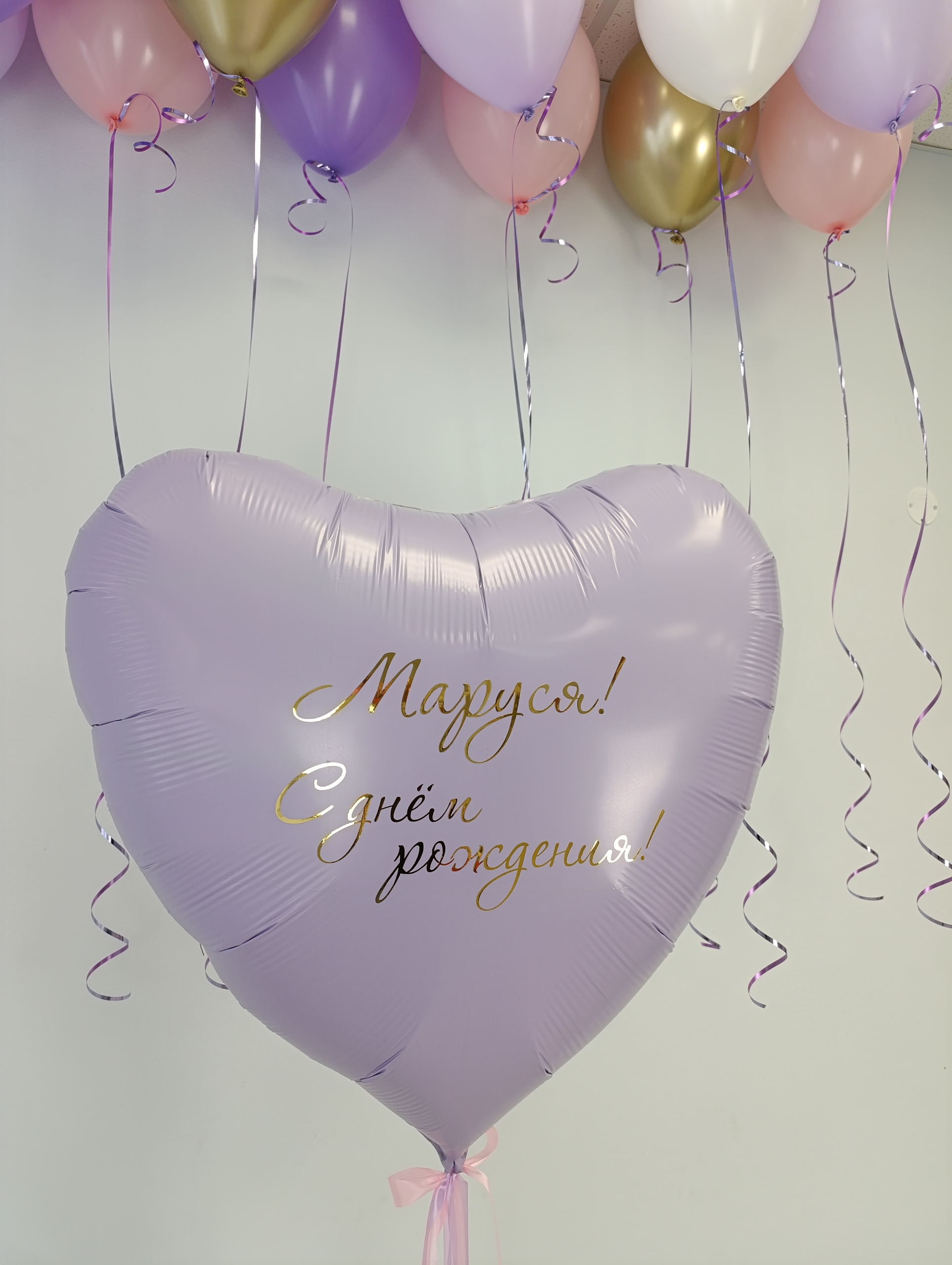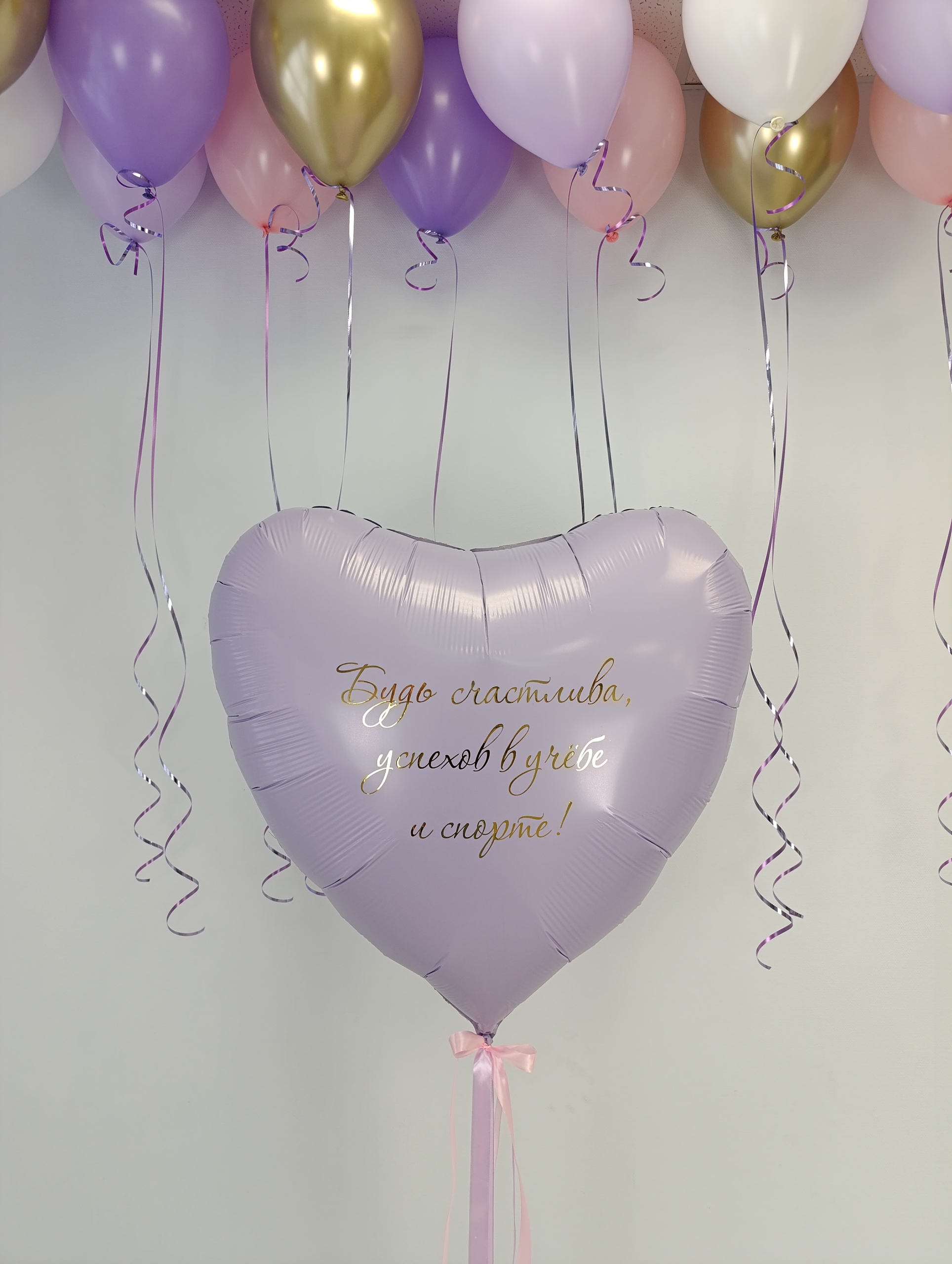 Большое сердце, индивидуальные надписи с 2-х сторон Под потолок 13 шаров - 3 шара из палитры хром, 10 шаров стандарт