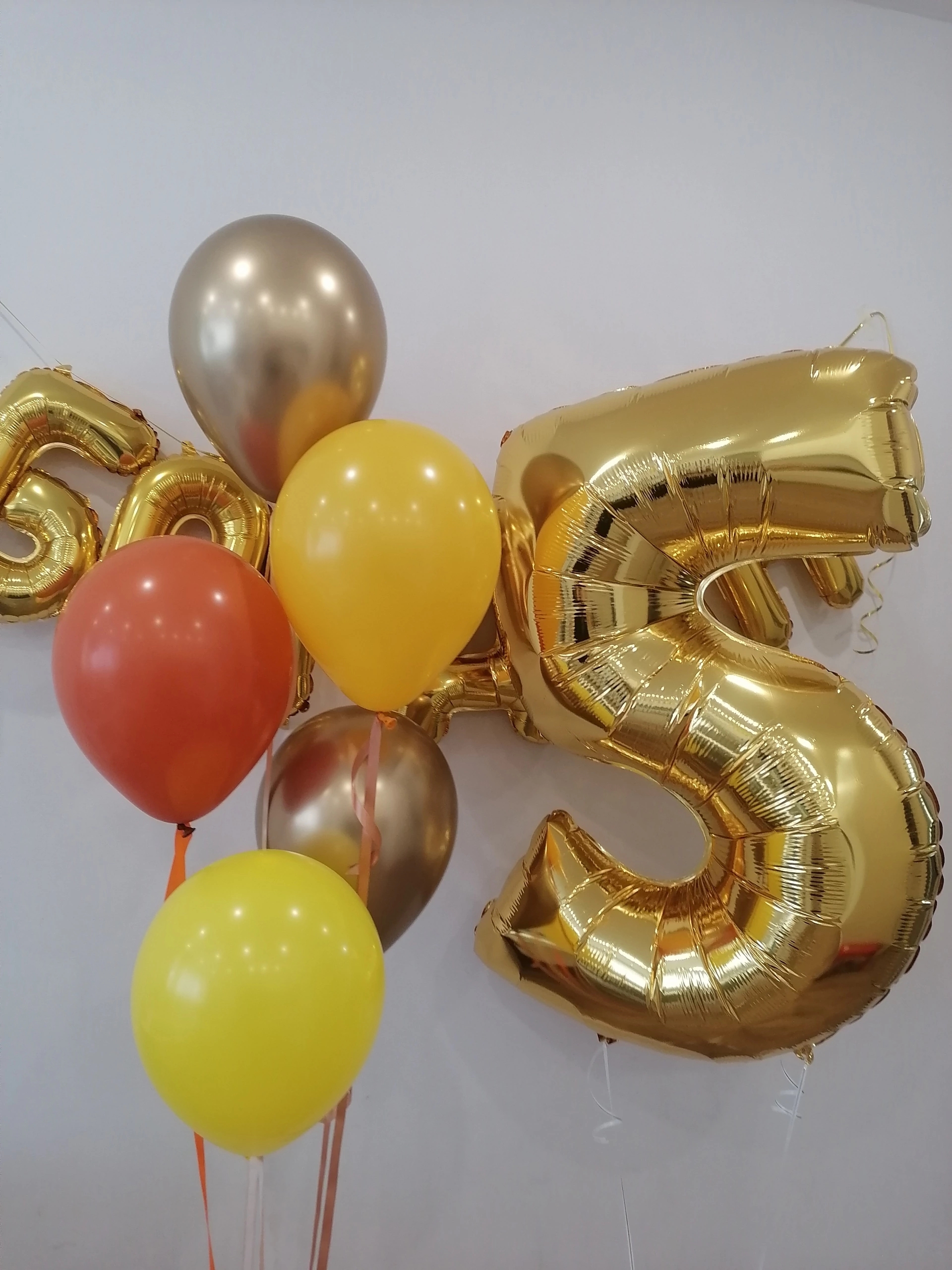 В наборе: Большая цифра Фонтан из 5-и шаров (2 хром, 3 стандарт) Шары в фонтане на атласных лентах