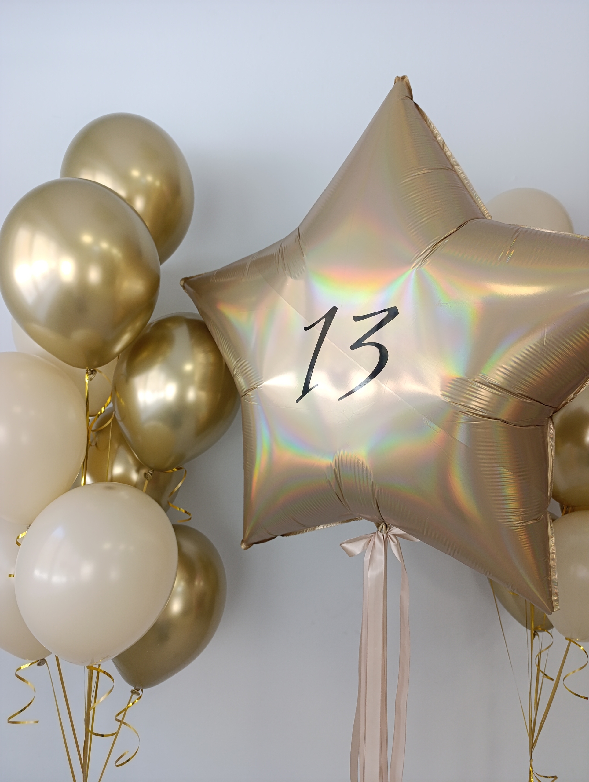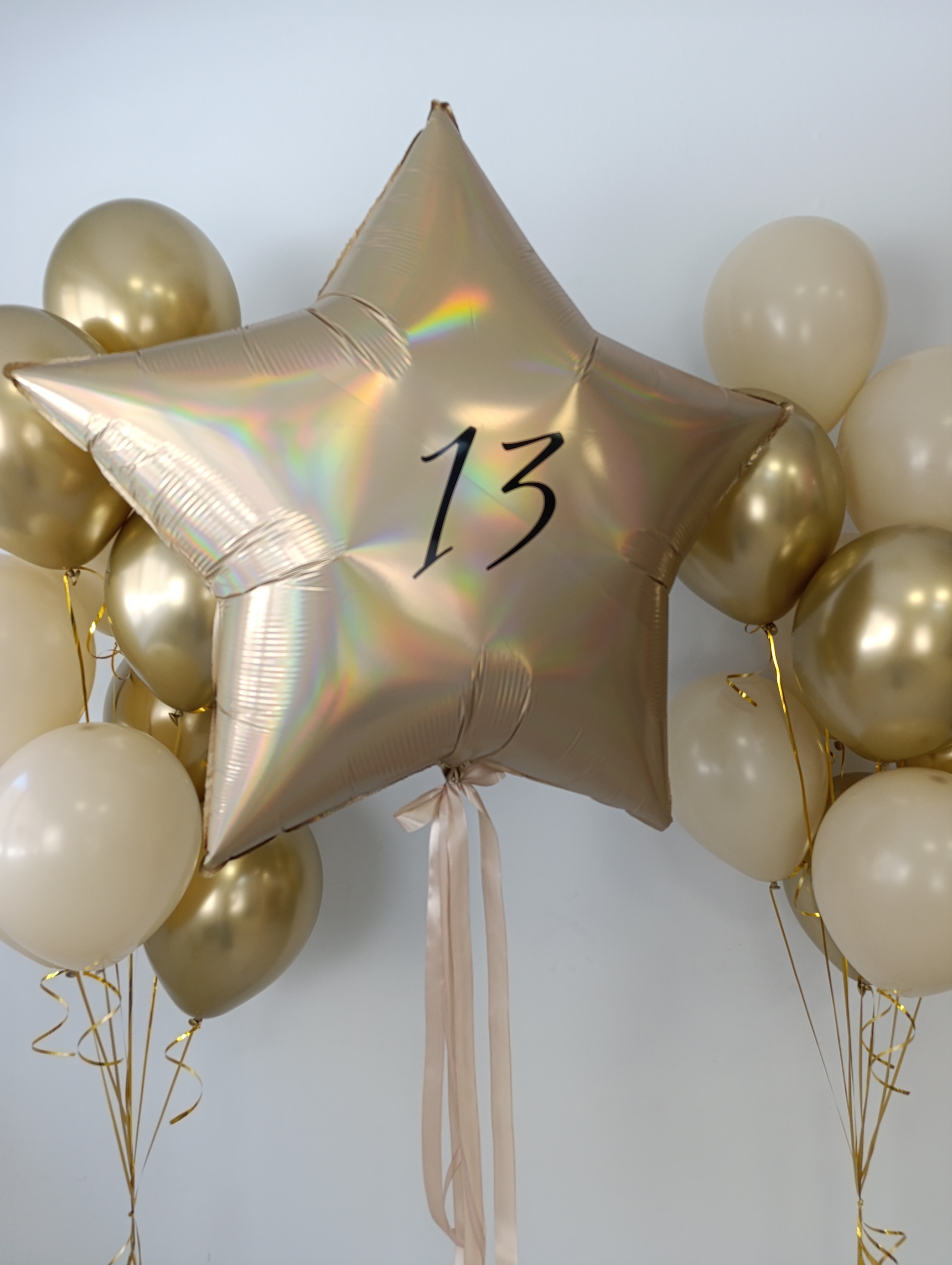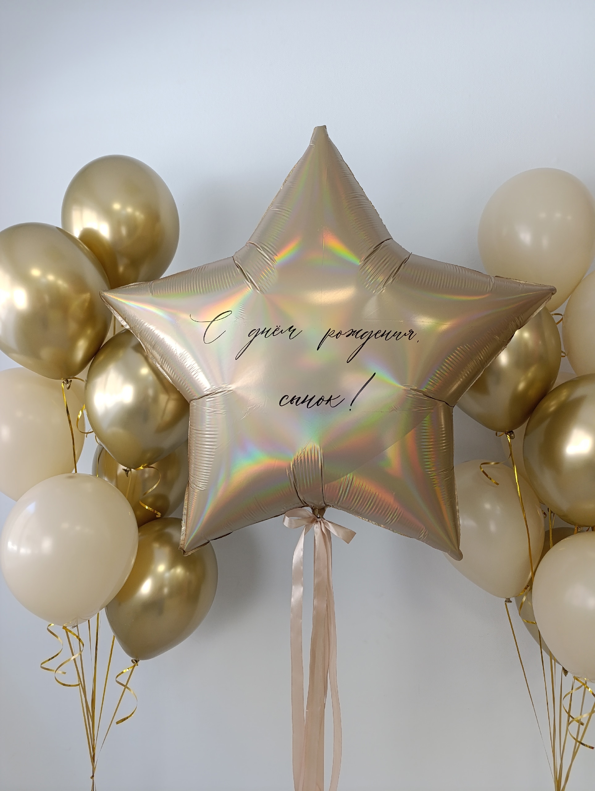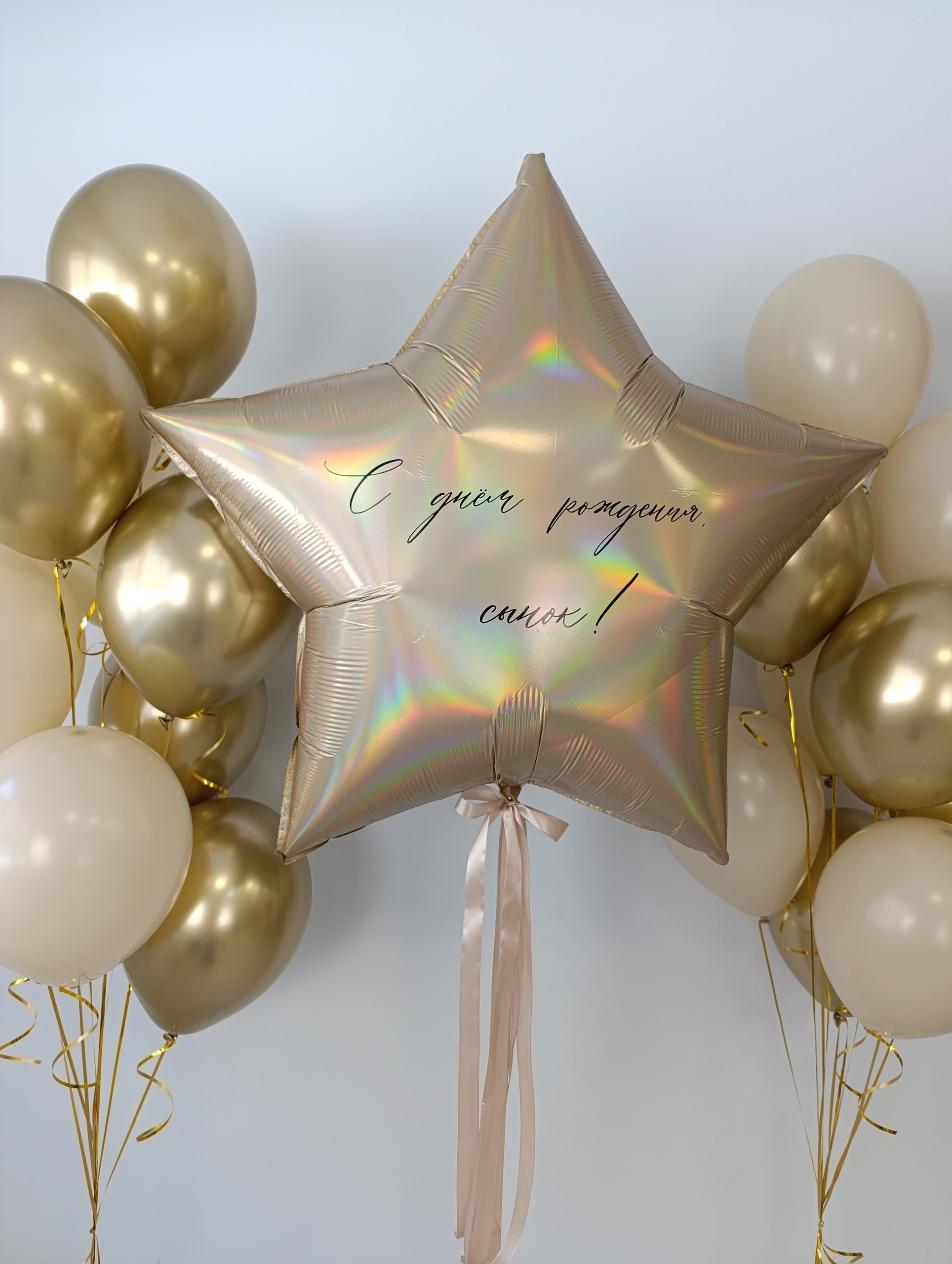 2 фонтана по 9 шаров (5 хром золото, 4 белый песок) Большая звезда с надписями с 2-х сторон