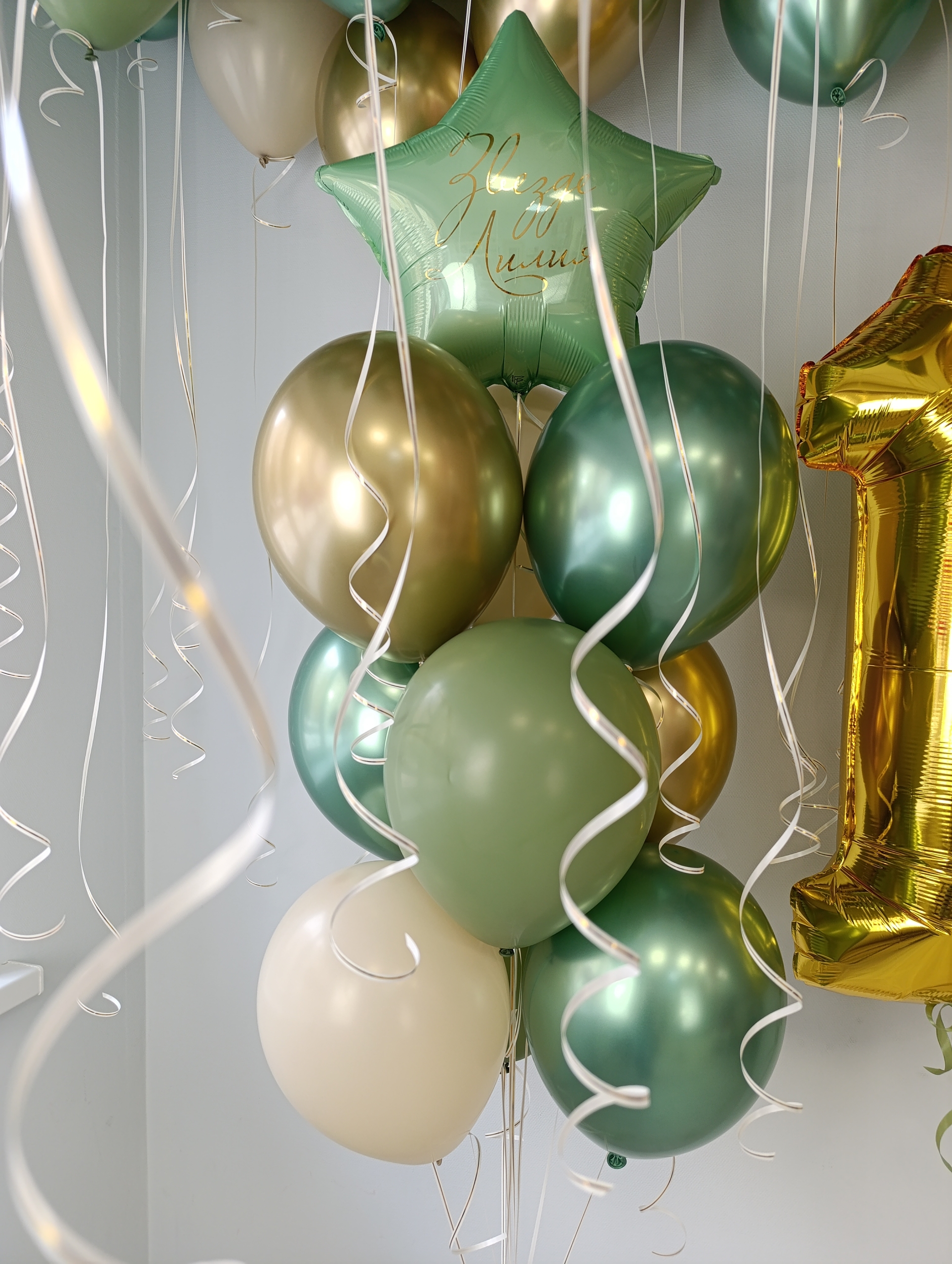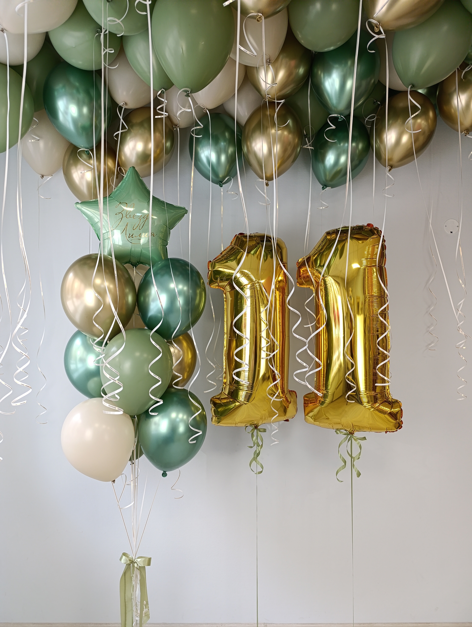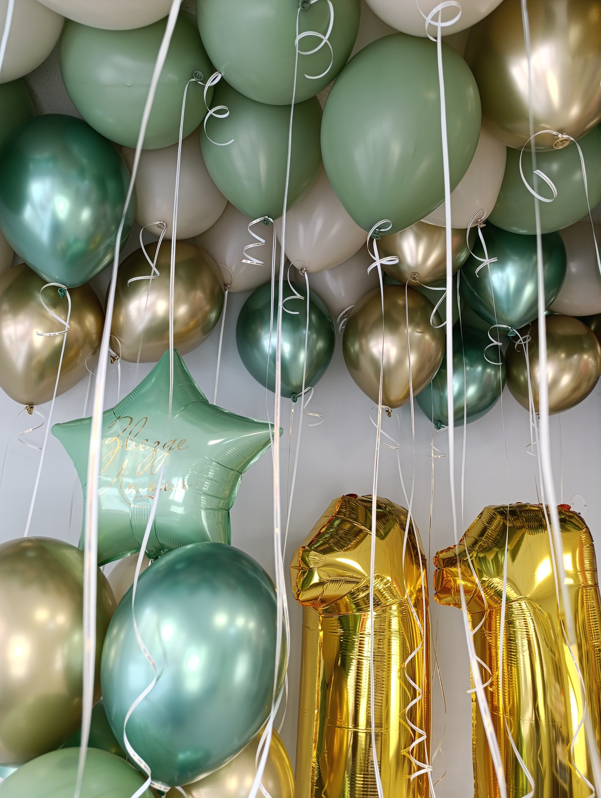 В наборе: 1) 50 шаров под потолок (25 шаров хром, 25 шаров пастель) 2) фонтан - звезда с инд. надписью, 5 хром, 4 стандарт 3) 2 большие цифры