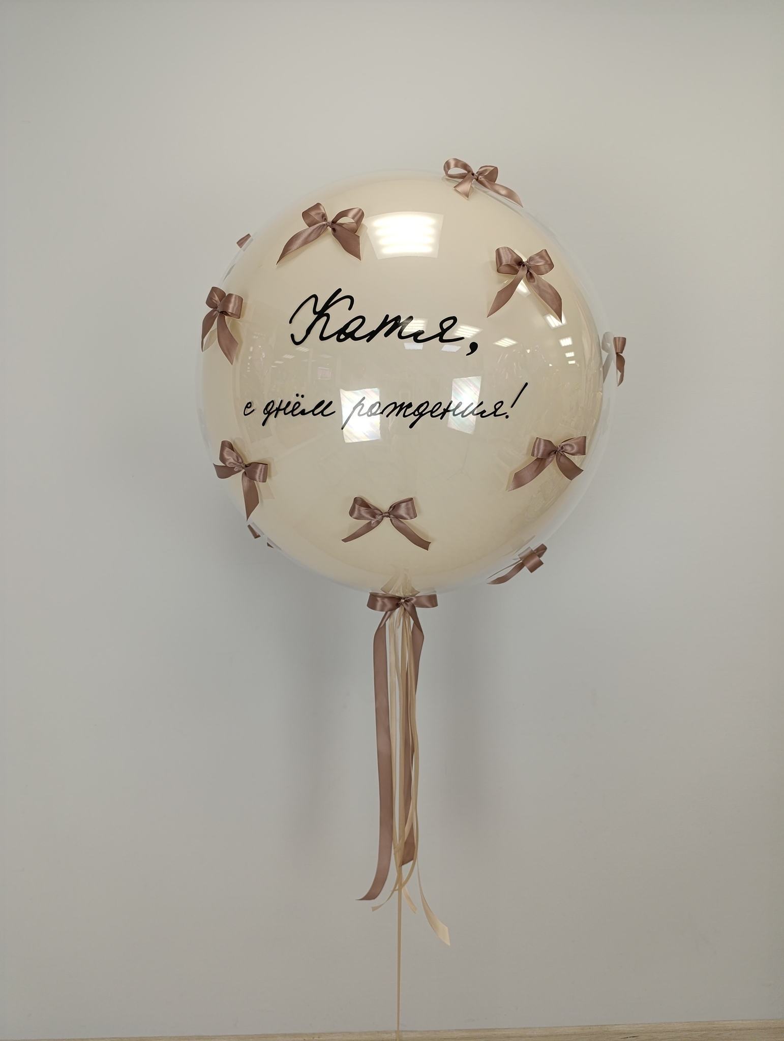 "Стеклянный" шар-гигант с надписью и бантиками Шар около 60 см Надут гелием, на грузике Цвет шара, цвет бантиков и надпись подбирается индивидуально