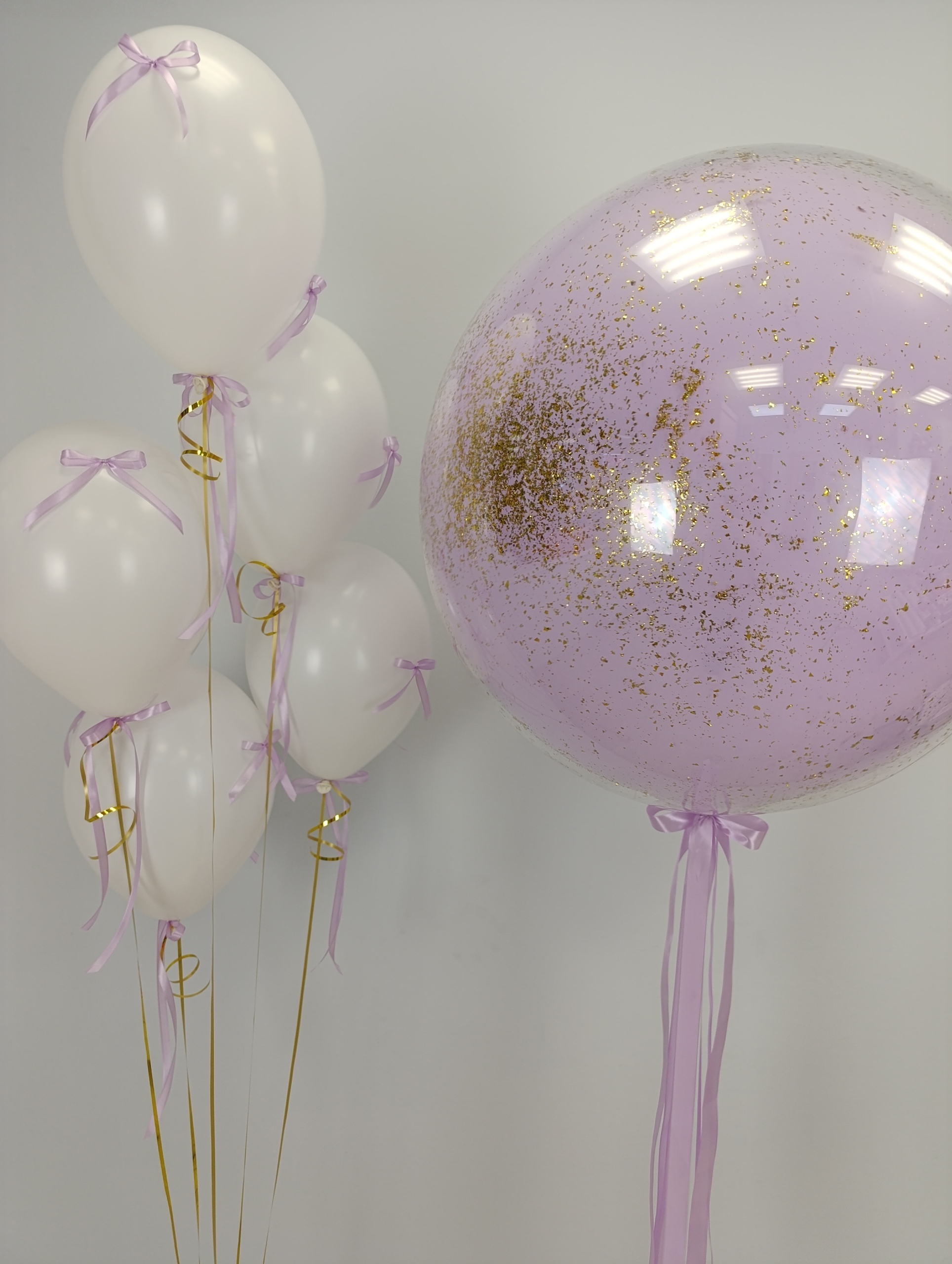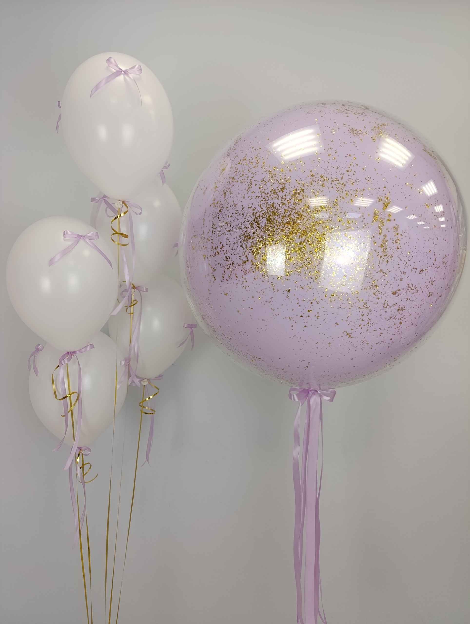 В наборе: "Стеклянный" шар-гигант Фонтан из 5 шаров с бантиками По желанию на большой шар можно добавить любую надпись