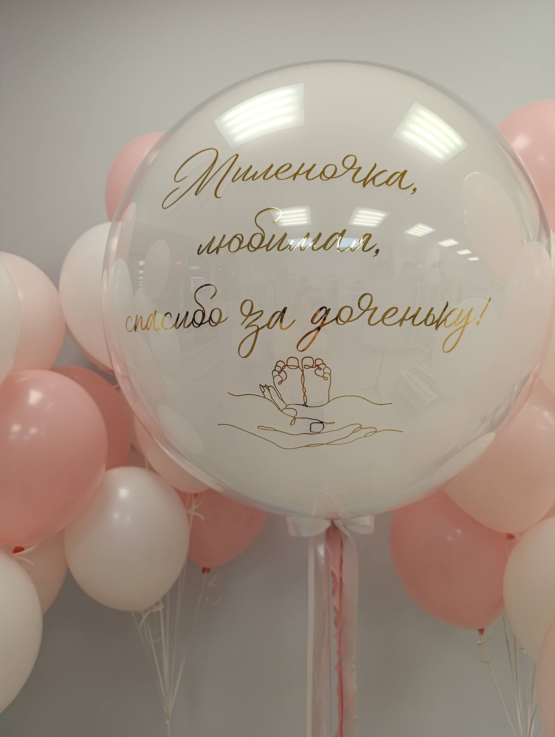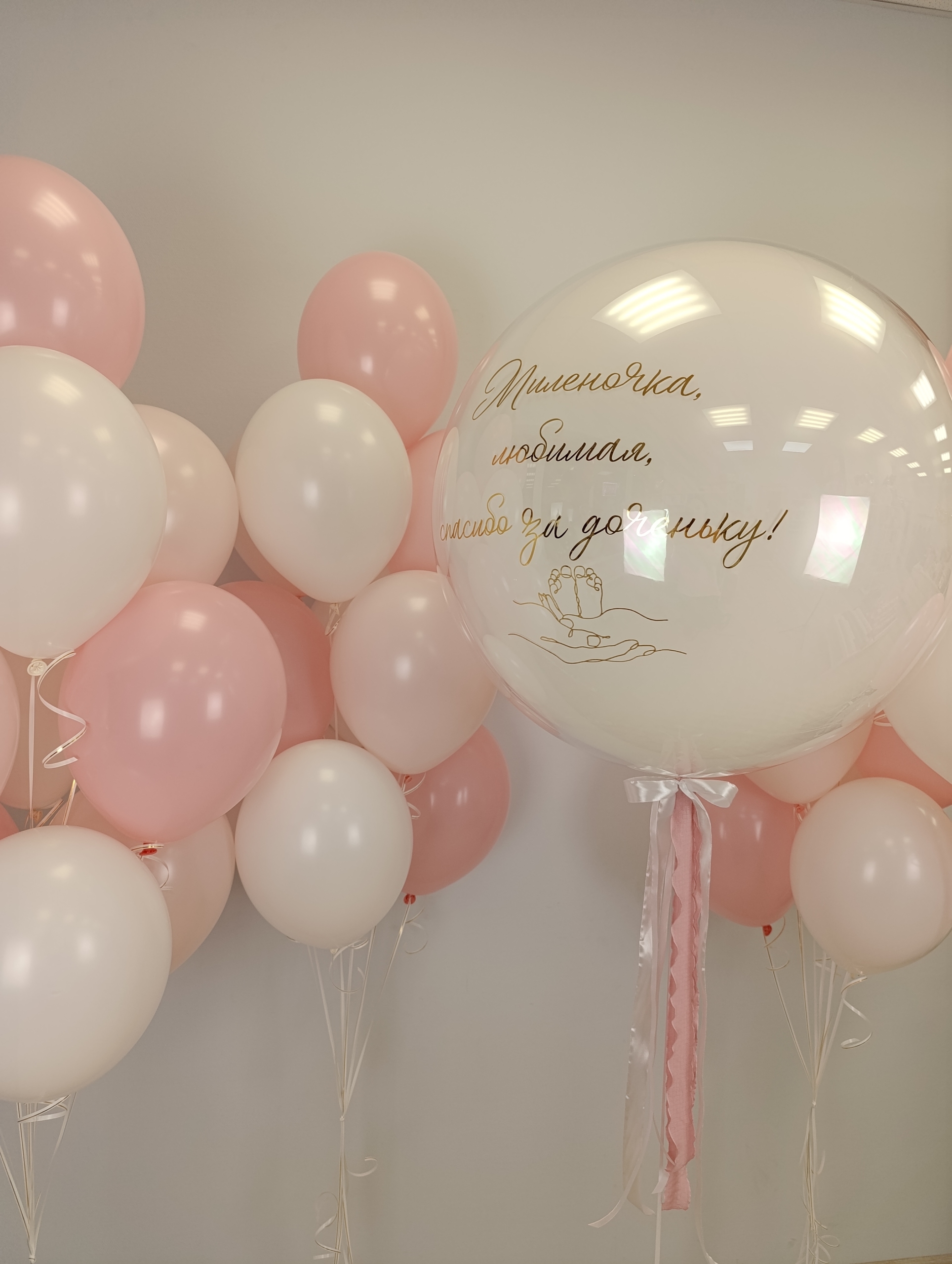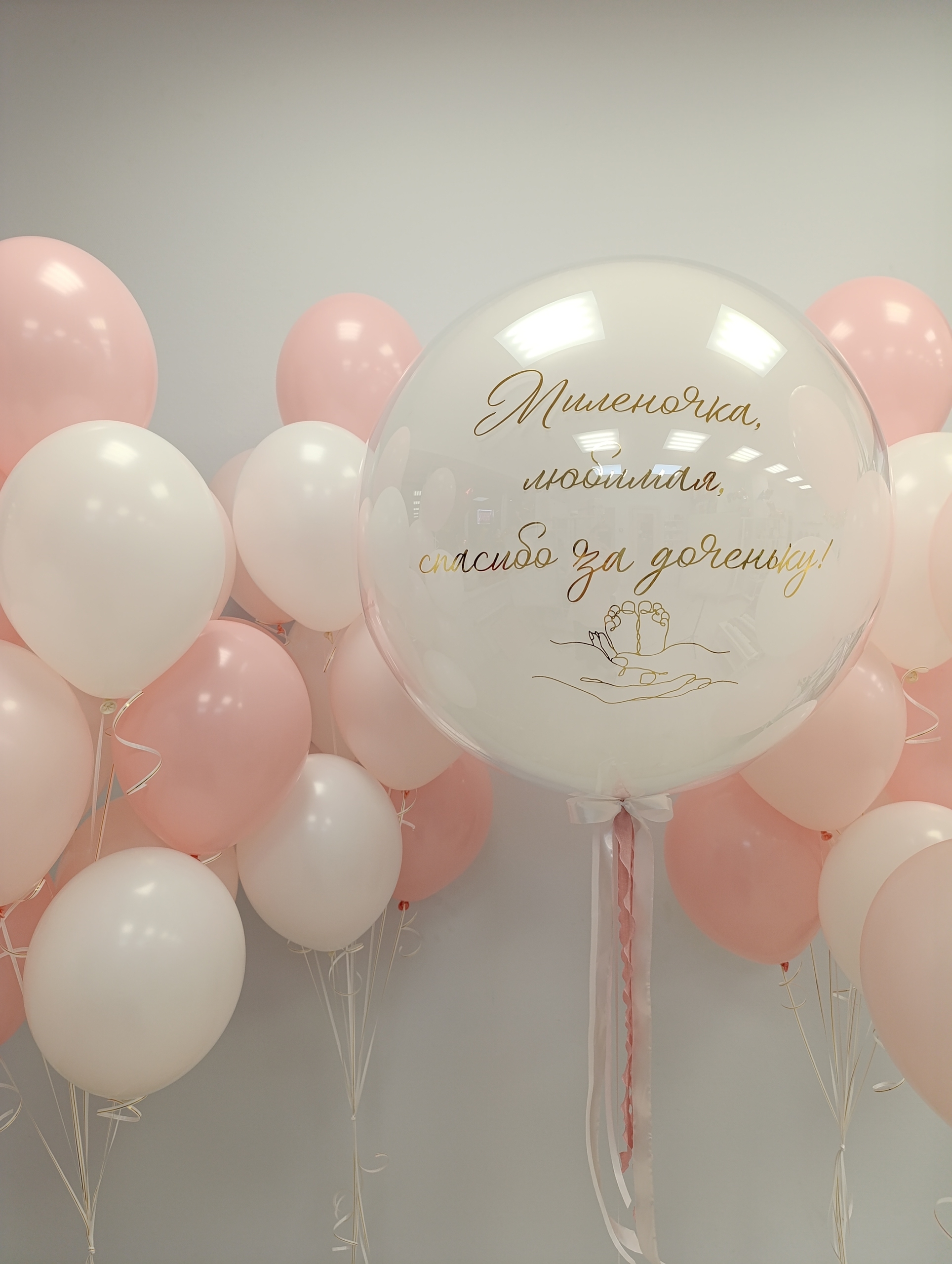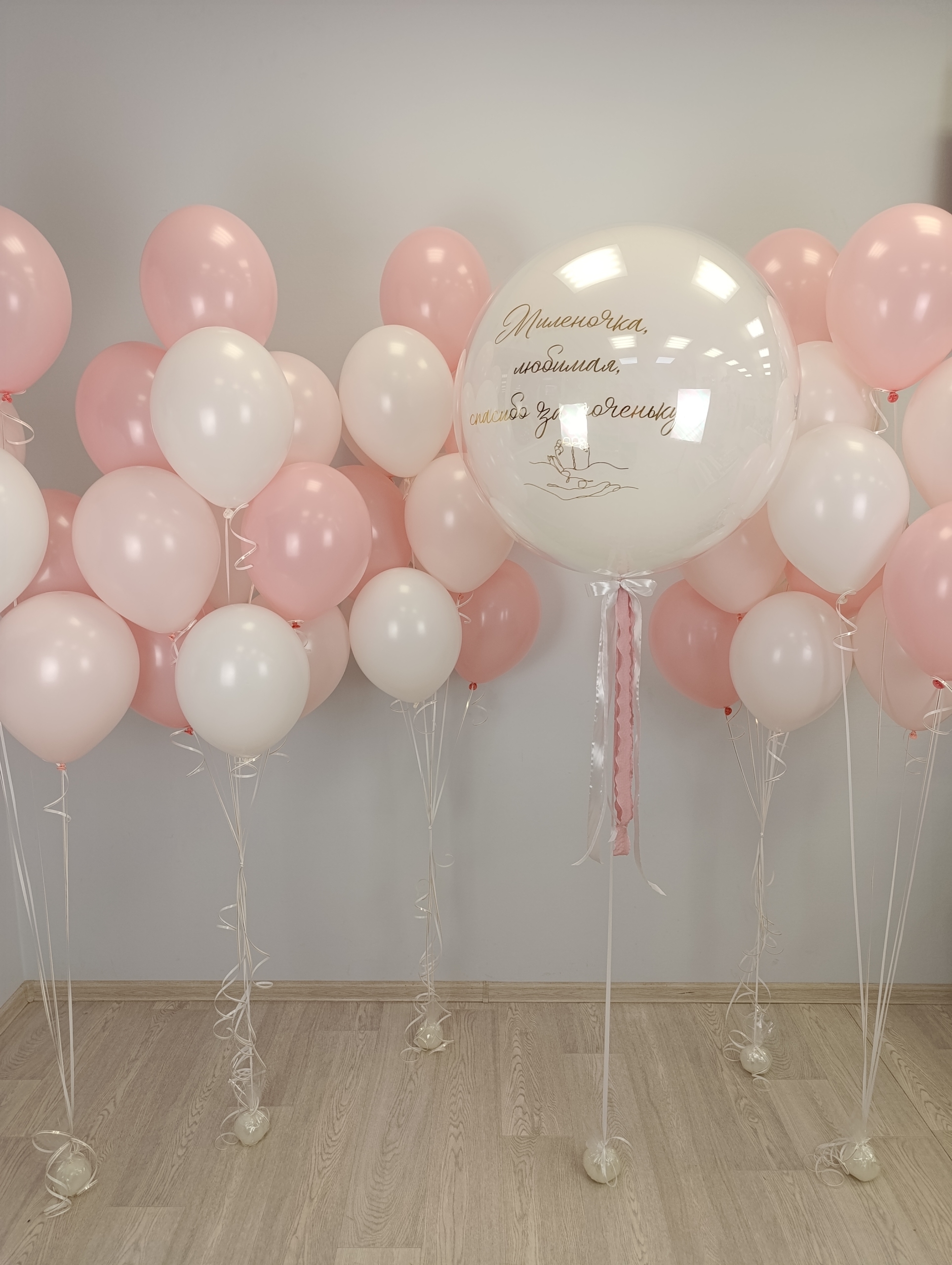 Большой набор для красивой встречи мамочки с малышом В наборе: Большой "стеклянный" шар с надписью 3 фонтана по 10 шаров 2 фонтана по 5 шаров