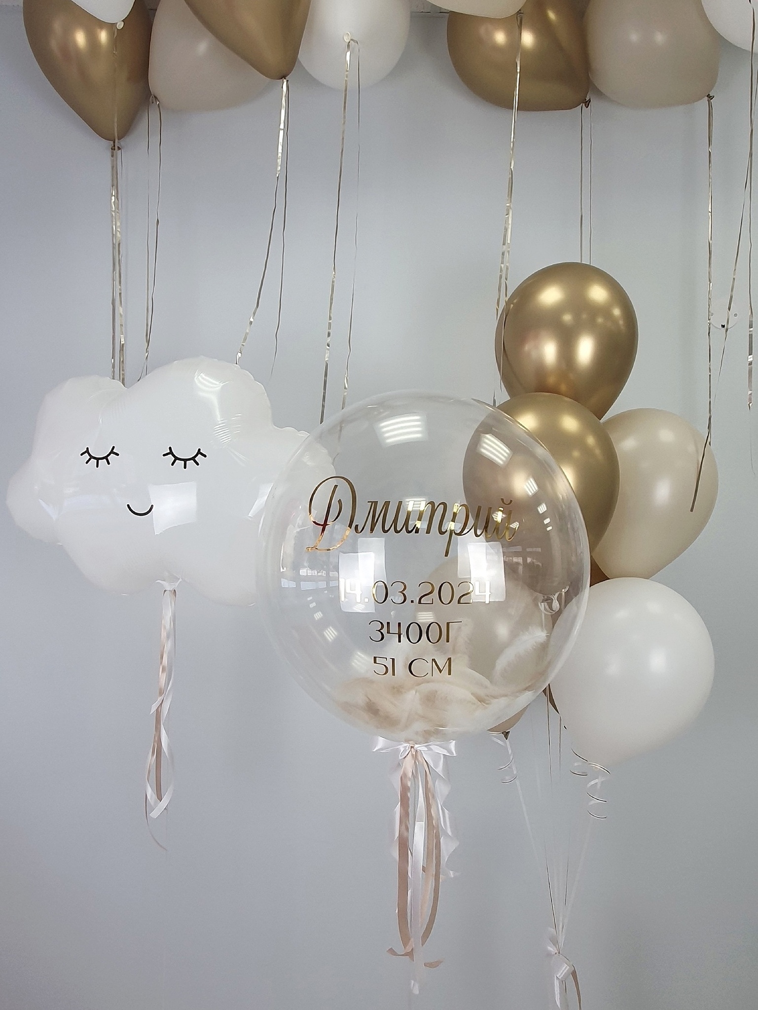 Нежный набор для самой красивой встречи с малышом Состав: Баббл с пёрышками и надписью Фигура Облако Фонтан из 7 шаров - 3 хром, 4 стандарт 10 шаров