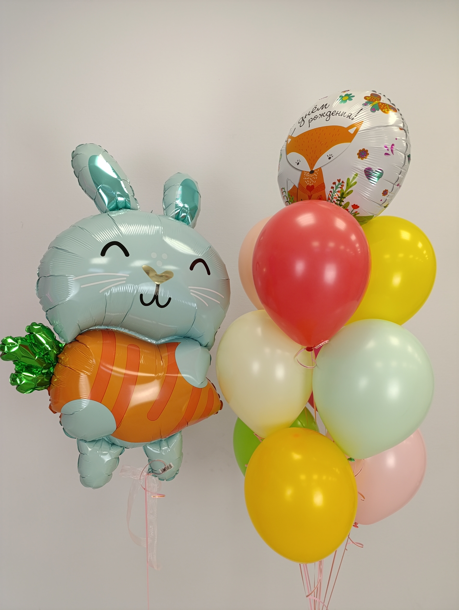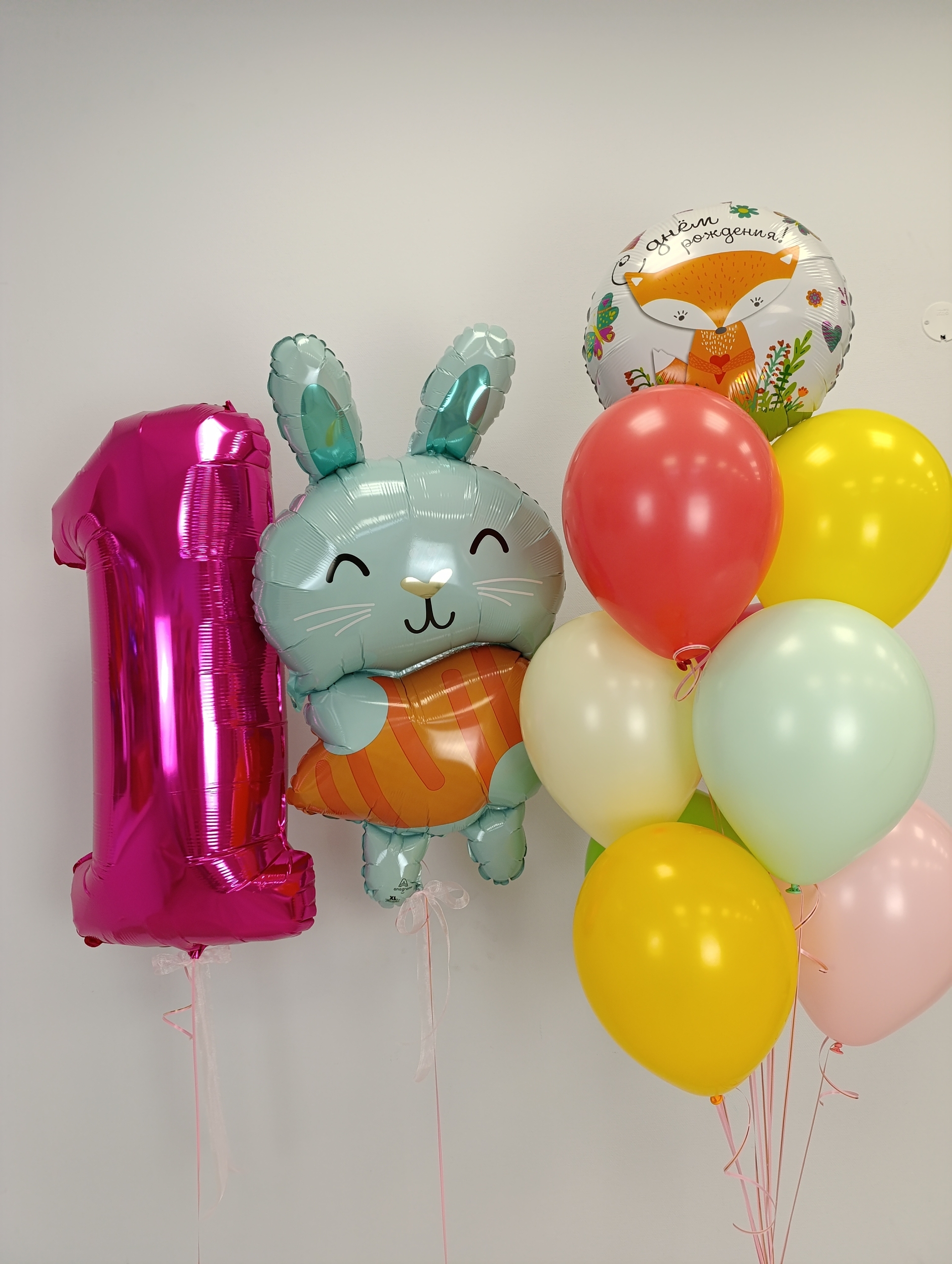 В наборе: Большая цифра Фигура Зайка Фонтан из 10 шаров - 9 цветных шаров и круг с рисунком